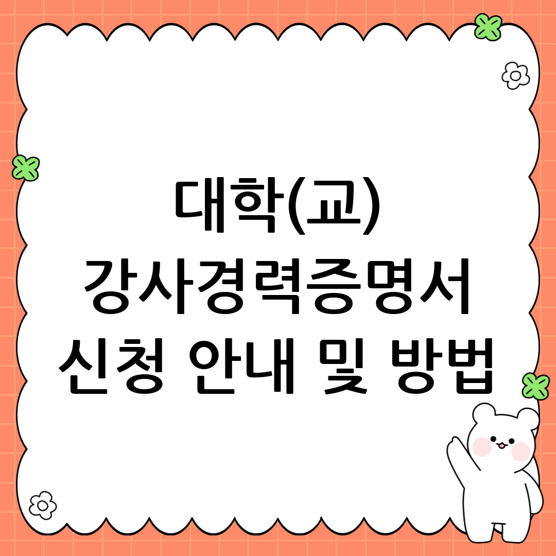 대학(교) 강사경력증명서 신청 안내 및 방법 민원24 바로가기 대학교 강사 경력 증명은 강사로서의 경력을 공식적으로 인정받고 증명하는 중요한 문서입니다. 이 문서는 다양한 목적으로 활용될 수 있으며, 본 가이드에서는 대학교 강사 경력 증명을 신청하는 방법, 절차, 필요 서류 등을 상세하게 안내합니다. 대학교 강사 경력 증명 개요 대학교 강사 경력 증명은 시간강사, 겸임교수, 초빙교수 등 다양한 형태로 … 더 읽기